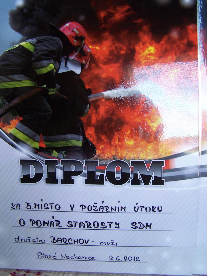 V sobotu 2.6.2012 se konala soutěž „o pohár starosty SDH“ u hřiště ve Starých Nechanicích. Počasí bylo chladné, větrné a všichni byli docela zmrzlí, navíc zcela deprimováni z výsledků prvního kola (muži byli předposlední a ženy uprostřed soutěžního pole) a někteří i společensky unavenější z předchozího večera (první Kunčice). A tak se po prvním kole polehávalo, odpočívalo ale i hodně diskutovalo, zkoušelo. Každý se zapojil a obě družstva ve druhém kole podala vynikající výkon!!! Takže konečné umístění v konkurenci i některých družstev z východočeské ligy = 3.místo muži (21:20) a 3.místo ženy (26:37)= považujeme za vynikající umístění.