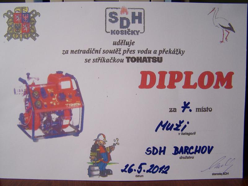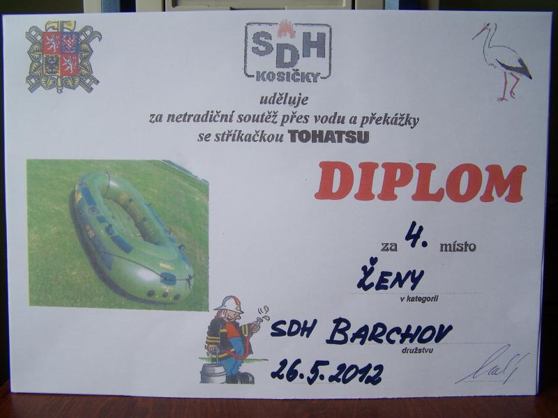 V KOSIČKÁCHv sobotu 26.5.2011 se naši hasiči a hasičky zúčastnily netradiční soutěže „se stříkačkou Tohatsu přes vodu a překážky“. Bohužel se nám nedařilo tak jako v předchozích ročnících a naše družstva skončila na 4.místě (ženy) a 7.místě (muži). Děkujeme všem našim divákům, kteří přišli fandit. Jako vždy byla podpora barchovských diváků nejvíce slyšet.